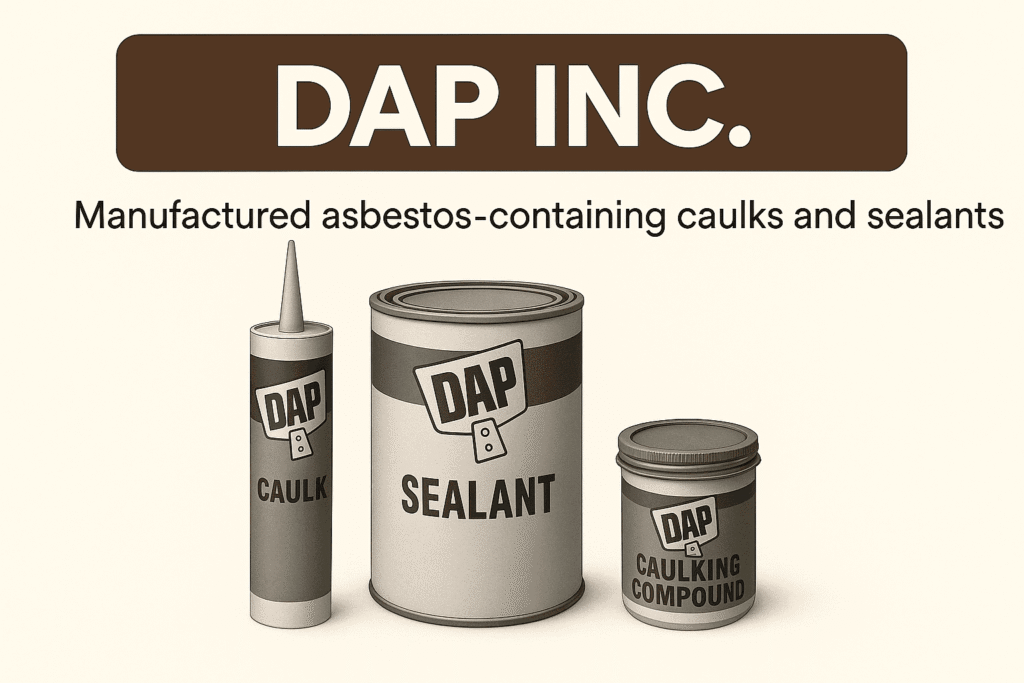 DAP Inc. (originally Decorative Asphalt Products) became a leading manufacturer of caulks, adhesives, sealants, and spackling compounds. From the 1940s through the late 1970s, many of these products contained asbestos fibers to enhance heat resistance and durability. As a result, workers and consumers were exposed to airborne asbestos dust during application, sanding, and removal.