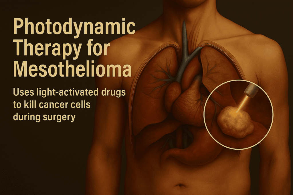 Photodynamic therapy (PDT) is an emerging treatment for mesothelioma that uses a combination of a special light-sensitive drug (photosensitizer) and targeted light to kill cancer cells. Once the drug is absorbed by the cancer, a laser light activates it, producing a form of oxygen that destroys nearby malignant cells.